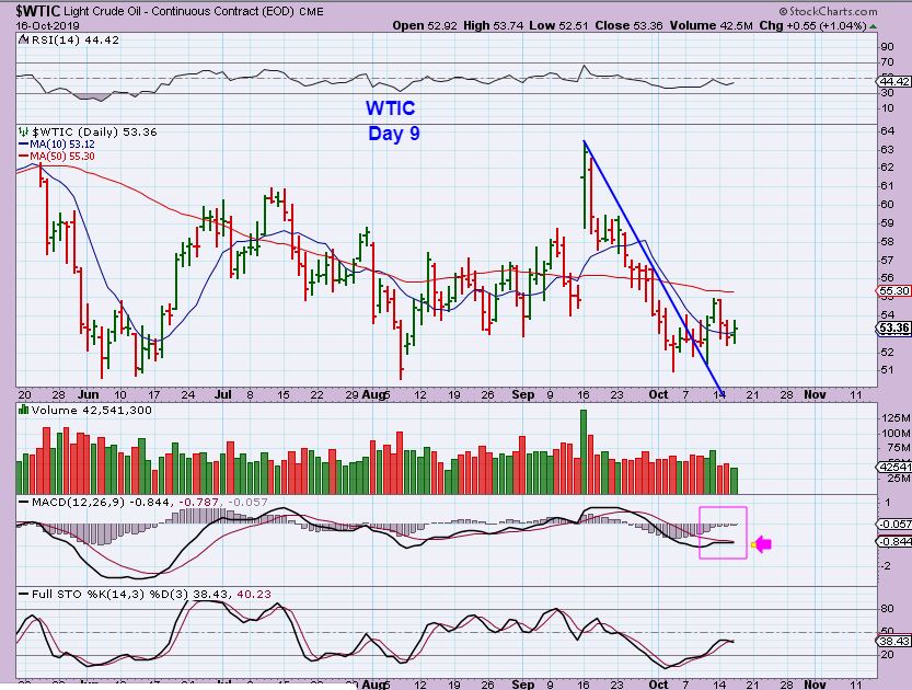 WTIC – Yesterday Oil dropped, yet the XLE moved higher. Now Oil flipped back above the 10sma and it appears to be day 9. We see 2 long daily cycles that went nowhere so far…