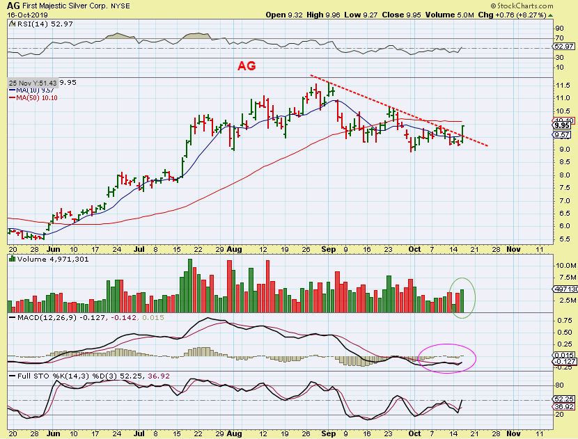 AG – Ag had a strong 8% reversal and it broke the downtrend line. This actually looks Bullish, and under normal conditions, I would buy that with a stop under Wednesdays lows. We’ll see what happens at the 50 sma Thursday.