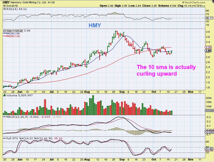HMY – This is also bullish looking with a 10 sma curling higher, but again, I want to be patient for now. I do want to re-buy HMY. It ran steady for me on the last run.