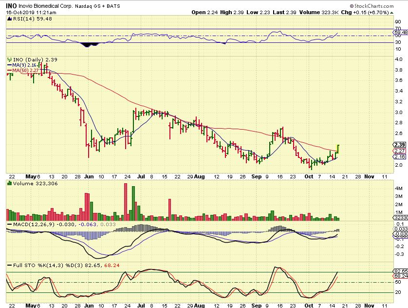 INO – I captured this at 11:30 as it broke out. It kept running & closed up 12%, but if it forms a bull flag or tags that 50sma later, it would be a buy opportunity.