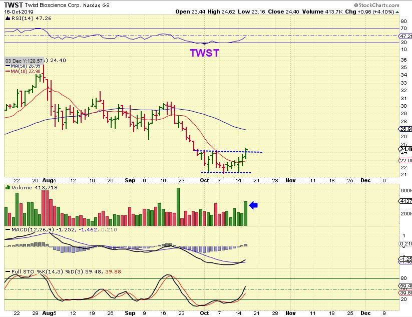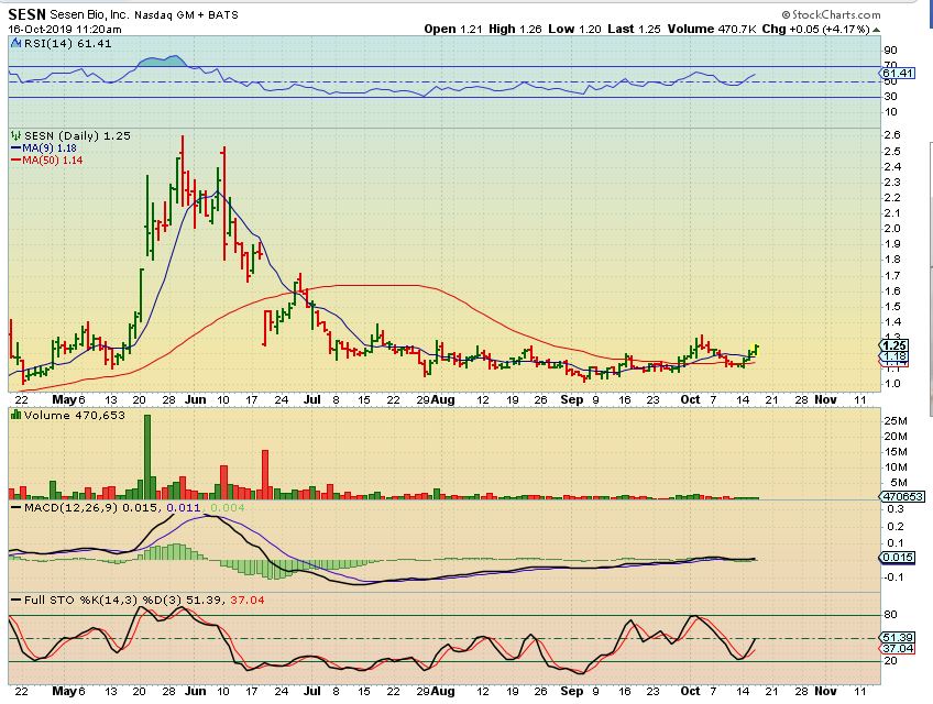 SESN – Many beaten down Biotech Stocks have formed nice bases. SESN broke above the 50sma, back tested it, and might break & run from a long base.