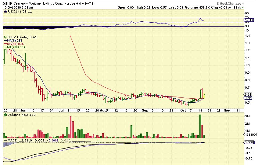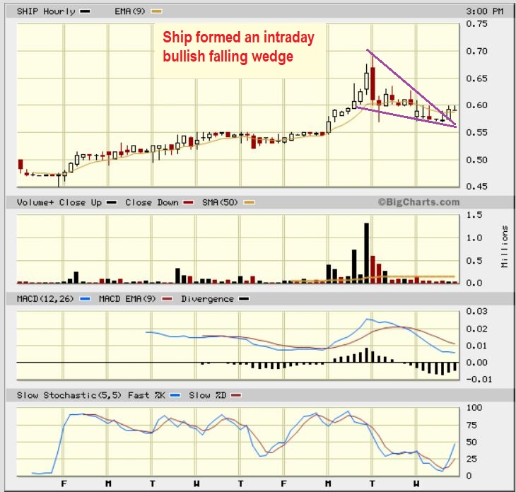 SHIP Intraday- When you break it down to an intraday chart, we had a run, a drop, and then a consolidation wedge formed. It broke the wedge at the close yesterday under 60 cents and could now run higher again,