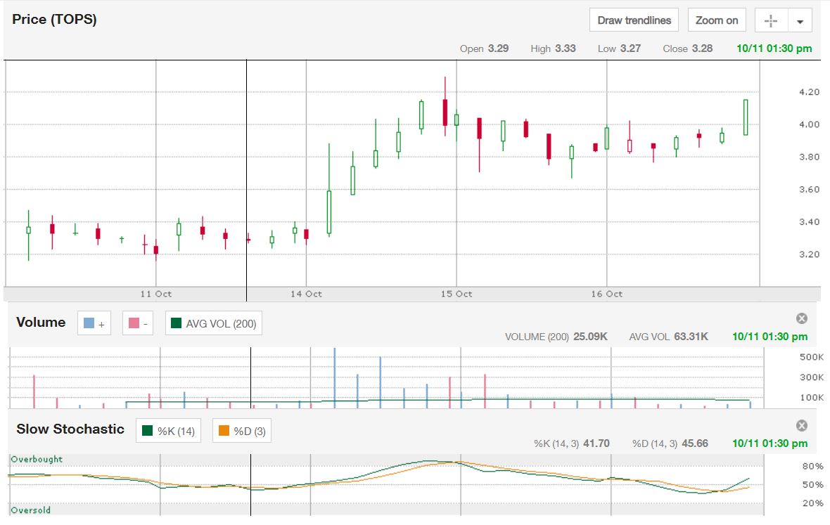 TOPS INTRA-DAY – That sideways flag was forming a cup. Suddenly it started to break higher above $4 and on this scale, it looks like a bullish Cup.