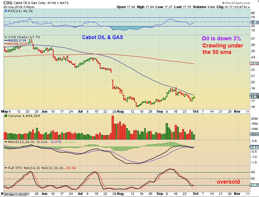 COG – Cabot Oil & Gas actually closed up 17 cents and that is the 2nd day in a row that it was green with Oil down. It is basically crawling under the 50 sma , which is usually bullish preceding a break out, so this could go on a watch list if you are interested in a trade for this sector.