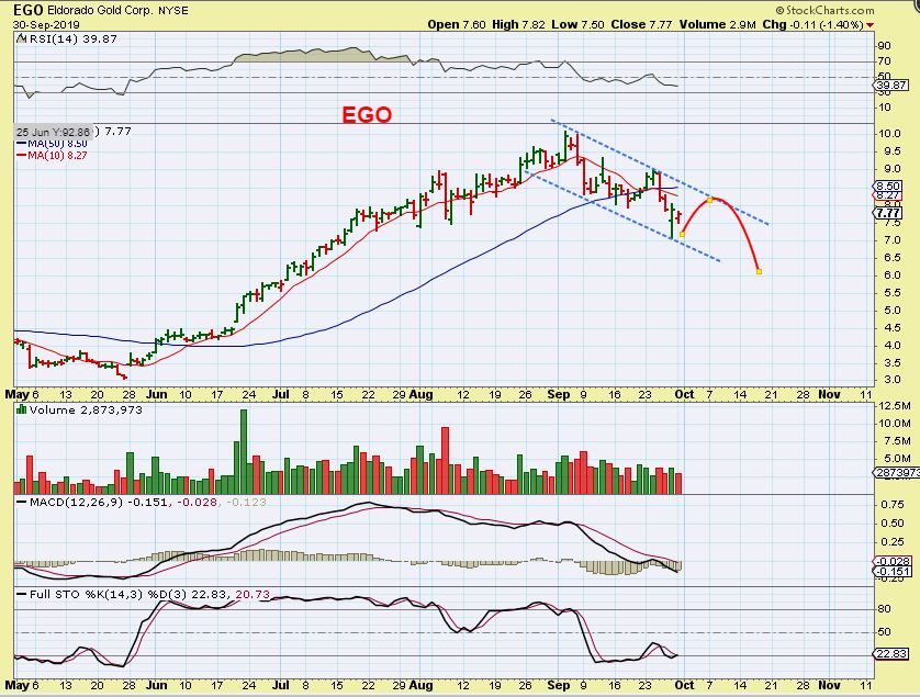 EGO – The same applies here. EGO tripled on the way higher. Wow, $3 to $10! It trades at $7.77 as of Monday. Buying at $6 later this month would be great, riding it from $10 to $6 would not.