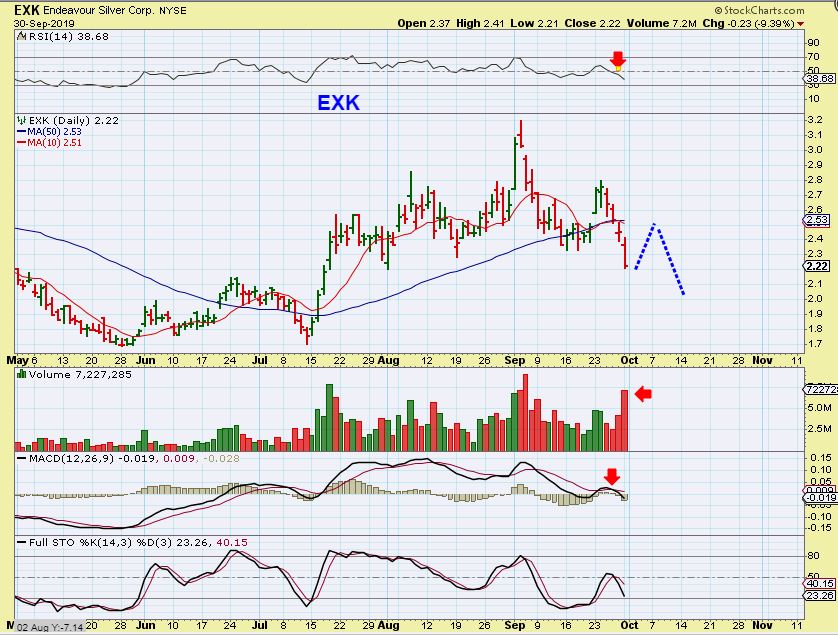 EXK -$1.70 to $3.20 is a 90% gain, but notice just how quickly those gains can go away. This recent 4 day drop was a pretty big drop all by itself ( $2.80 – $2.20 hurts). A bounce will draw in Buyers, it will look like a ‘shake out’, but based on Cycle timing, I think we have should still have more downside.
