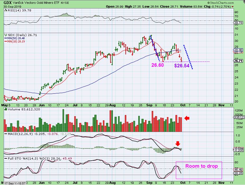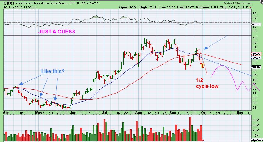 GDX – Miners peaked on day 7 and that should be the high point for this daily cycle, so even if Miners bounce after this measured move, IT IS NOT A BUY if you are following my methods. Buying a bounce into an ICL drop is painful. This can drop into the end of October if it wants.