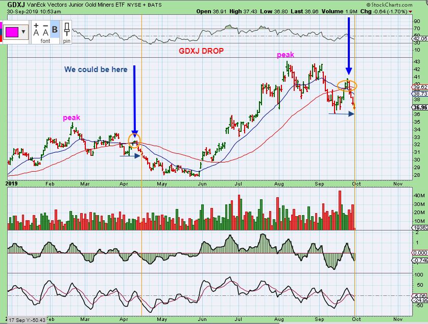 GDXJ – I have drawn where it looks like we are compared to the April drop into an ICL. A bounce back tested the 10 & 50 sma then too. The indicators match that time period too, so what do I see? There were bounces that lasted 5 days, but they were weak & choppy. It is not ‘time’ to buy yet if we bounce.