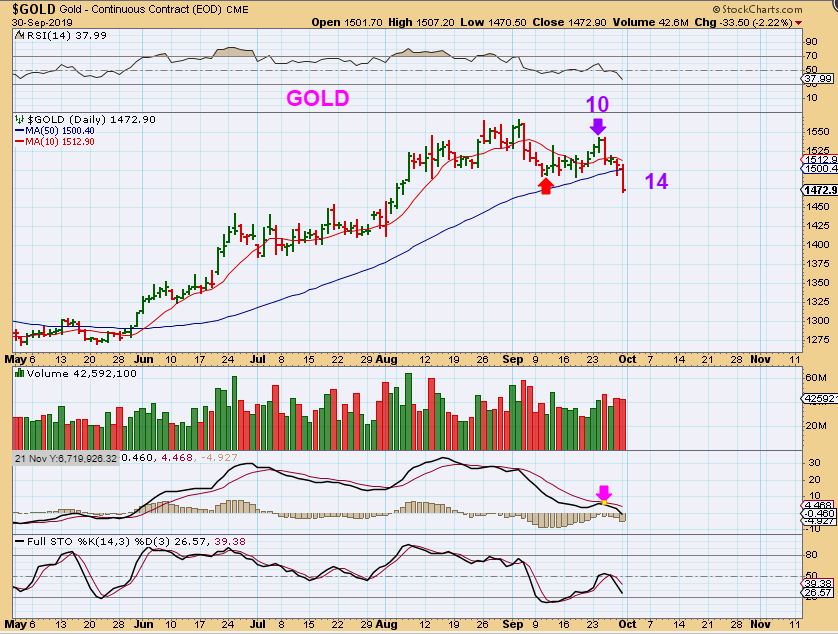 GOLD – Gold broke down as expected, since Miners were leading the way. This is only day 14, so if Gold or Miners puts in a bounce, please remember that it can still move lower for 2-3 weeks and likely will to become L.T. I have pointed out that Gold has formed a Head & Shoulders pattern.
