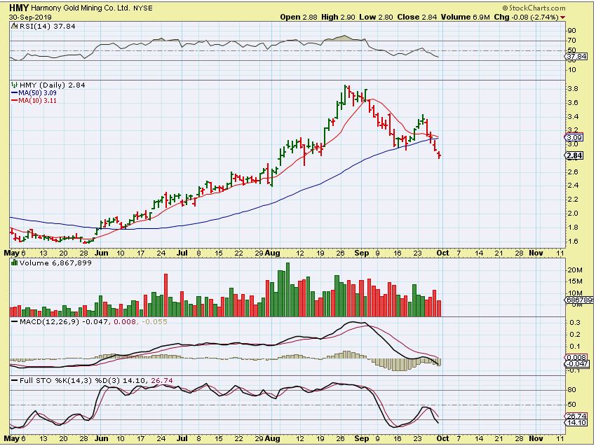 HMY – I Loved HMY, DRD, RGLD, EGO on the way up, but I sold my HMY & DRD positions knowing that after an Intermediate Cycle ‘peaks’, these can pull back 50 % with no damage to the charts. HMY ran from $1.70 to $3.80 , but it lost the gains quicker on the way down. HMY is already at $2.80, it would be a great buy after a bounce & 1 more drop.