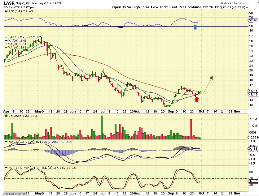 LASR – Something like what I see in LASR , for example, could be a buy with a stop under the 50 sma for ‘Traders’. $13 to $17 was the first leg, the next could make it to 19+