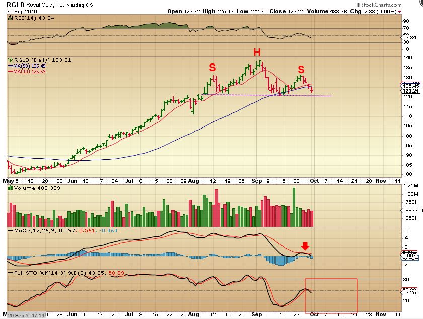 RGLD – RGLD ran from $80 to $138 and is actually holding the gains fairly well, but if this H&S breaks down, it can drop to the $100-$110 area.