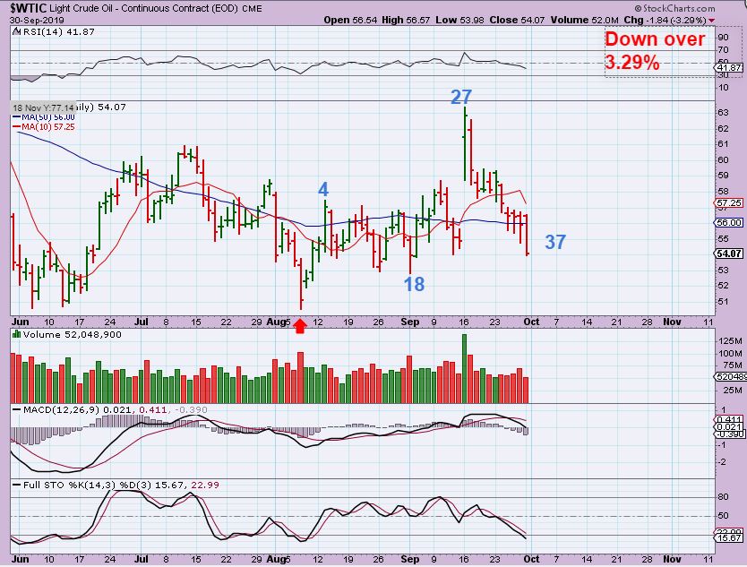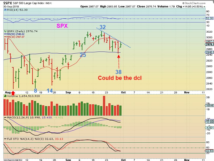 The General Markets are in their timing for a dcl, but it may only be a bounce like we saw in Miners. With GDX / GDXJ, that 7 day bounce was convincing, wasn’t it? Some that sold their Miners felt like they were missing out, but it rolled over after a day 7 peak and broke down further. We MIGHT see that with the stock market after several days too, but it is hard to know for sure with the additional Rate cuts from the Fed recently. If you usually go long the stock market, I would play it the same way that I said I play the Miners at that time. You can go long in case it runs, but use & raise a stop and you should be fine. Below I will also discuss Oil & Energy Stocks a little, and I also want to point out a few Miners charts.