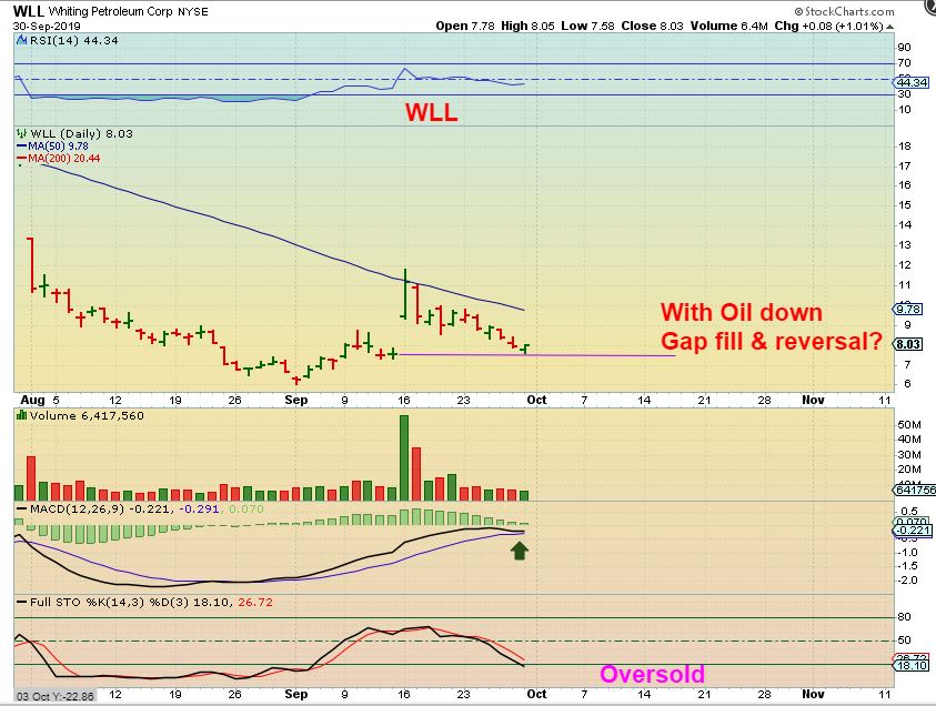 WLL – WLL dropped 37 cents Monday, but then moved higher into the close, closing up 8 cents. It looks to have finished a gap fill, we’ll see if there is any follow through higher. The MACD looks like a bullish kiss & it has finally reached oversold.