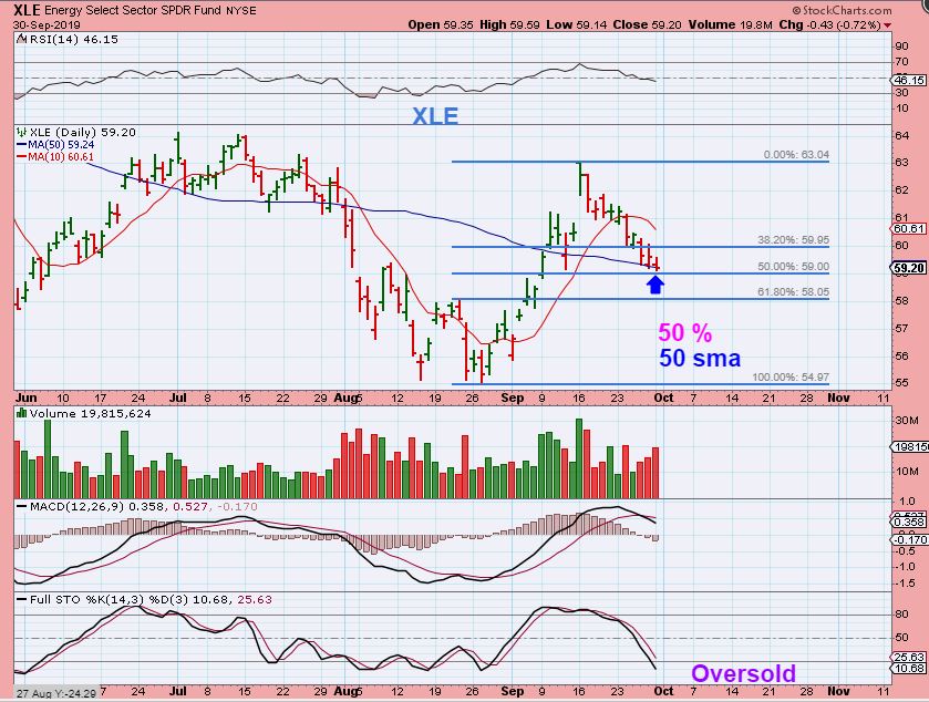 XLE – With Oil down over 3%, XLE held the 50 sma & 50% retrace. Gush was only down 2 cents, and some Oil stocks went green. I will discuss that at the end of the report, but I would still remain cautious. It might be worth starting a watch list though.