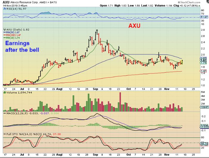 AXU  was moving higher Thursday, and  I do think that it has great potential.  Look at that last run from the ICL. It almost tripled, so I have been watching it.   They were due to release earnings after the bell, so I waited. With AXU,  you could also wait for a break above the 50 sma to buy, since even just forming a cup from here would be great.