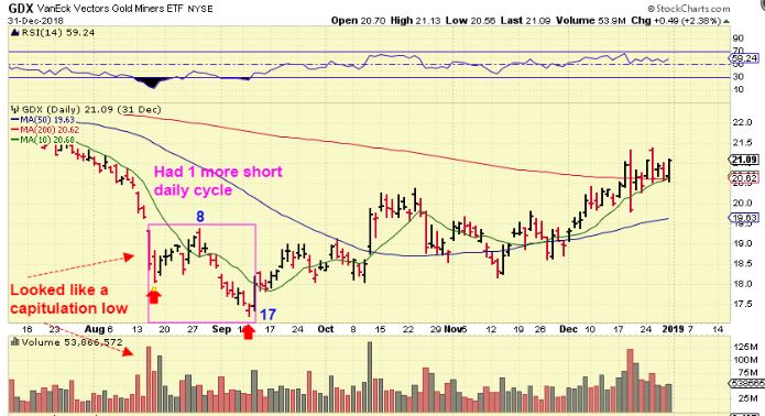–  GDX peaked on day 8 and rolled over for a final daily cycle.  That daily cycle was very short, but frustrating when it happened.