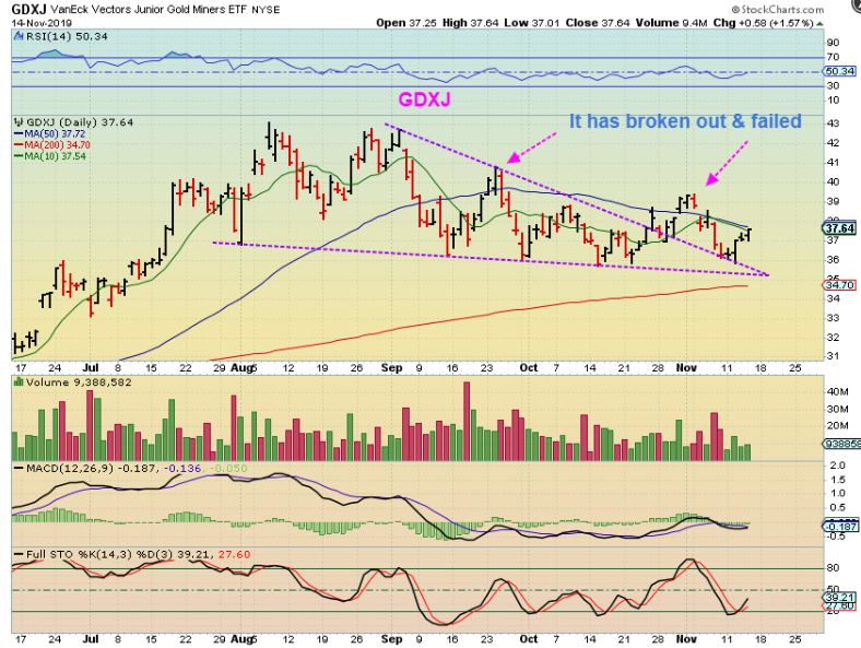 GDXJ – And GDXJ has formed a similar triangle set up, back test, and also slightly closed above the 10sma.  It now  pushes on the 50 sma.