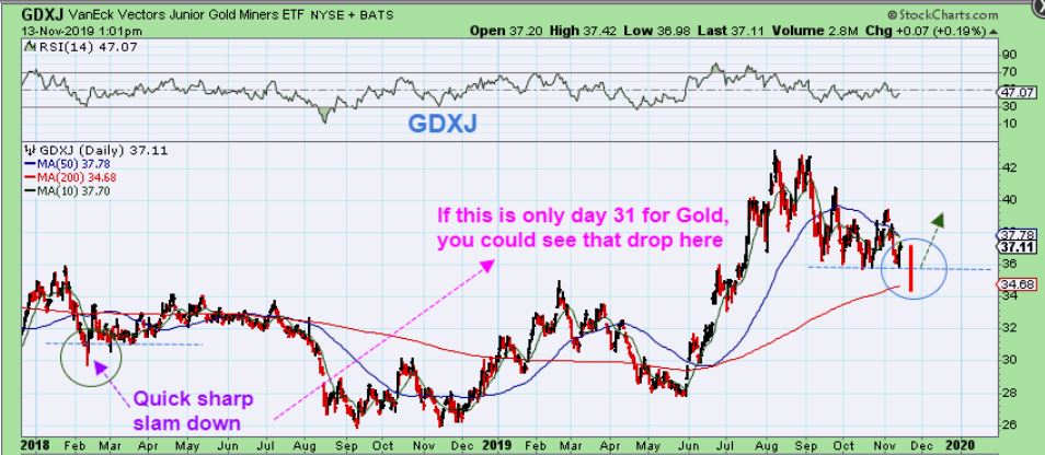 On Thursday, Gold, Silver, and the Miners  climbed out of what could be a Daily Cycle Low.   We have an unconfirmed swing low in Gold & Silver, but it is still possible that we can still get this kind of a quick slam down shown on the GDXJ chart.  We just want to be aware of that.  That would simply extend this daily cycles count by a few days .  Now let’s see what we have after Thursdays trading…