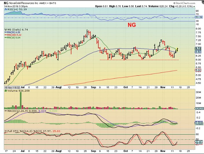 NG – Nova Gold also started to perk up this week, crossing back above the 50sma. This also looks like a large ‘Pan’ or cup formation.  As you can see on the left side of the chart, the last ICL run was great, and I would expect the next one to be great too after such a controlled consolidation.