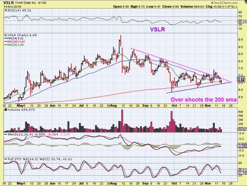 VSLR – I got stopped out of my VSLR.  VSLR bullishly popped after earnings  but then dropped back to the 200sma.  I did not notice that apparently VSLR has a reputation for losing the 200sma by 30-50 cents and regaining it.   That is exactly what it did here.  It may be a buy if it can pop above this apex, but I may just focus on Miners.  A run to $9 is not out of the question if this gets going.