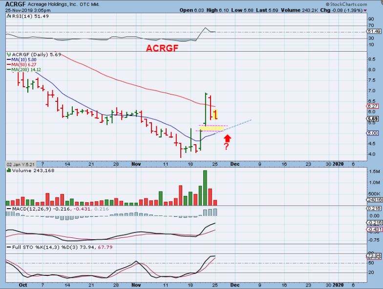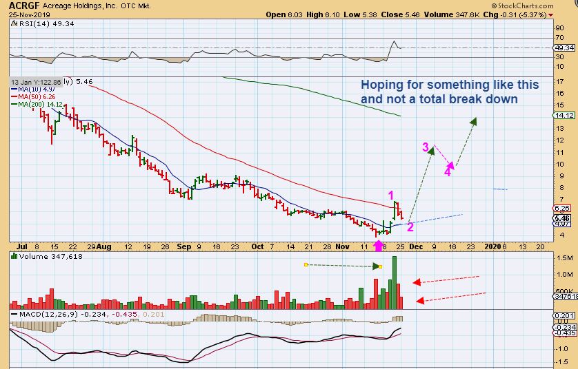 ACRGF  UPDATE – What a POP from under $4 to $7.  I bought the 2nd high volume break of the 10 sma and sold some above the 50sma.   The pull back is on light volume, so that is good. If this is going to remain bullish, it may just drop down and do a gap fill & reverse at the 10sma. I’ll be watching for a reversal there and if that happens…