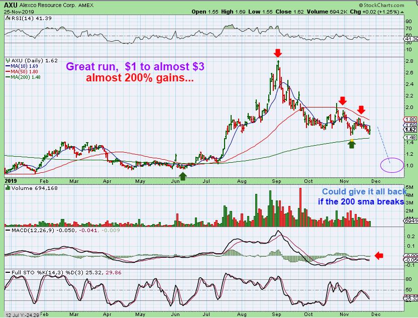 AXU – I was looking at AXU yesterday and realized that it has given most of its gains back.  This could become a great buying opportunity at the next ICL.  It ran from under $1 to almost $3 out of the last ICL.  It has returned to the 200sma and could drop even further. For now, it is pinched between the 200 & 50 sma.  A shake out at the 200 sma  could be a H&S pattern.