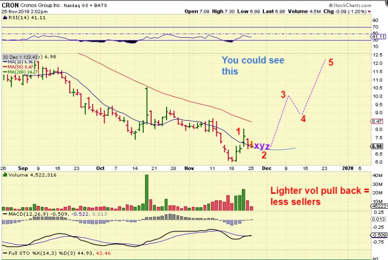 CRON – We would see something similar in several of these set ups. I drew CRON here with a possible crawl along the 50 sma, since I have seen that type of action in the past too.