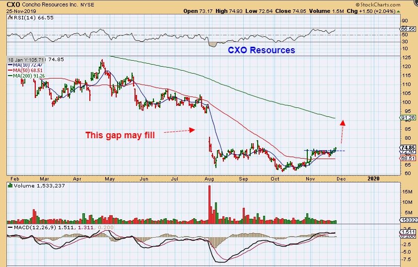CXO – This looks ready to move higher ( See a 3 moth chart). Here I am showing an upside target.