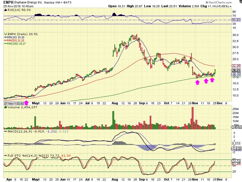 ENPH – After an extremely bullish run higher, ENPH finally started to consolidate those gains.  It finally reached the 200sma as a back test and rode along the top of it for over 2 weeks. Monday it broke higher and this is a low risk entry with a stop at the 200sma.  I captured this 1 hr after trading started and it closed with good volume ( over 8 million) and I bought it.