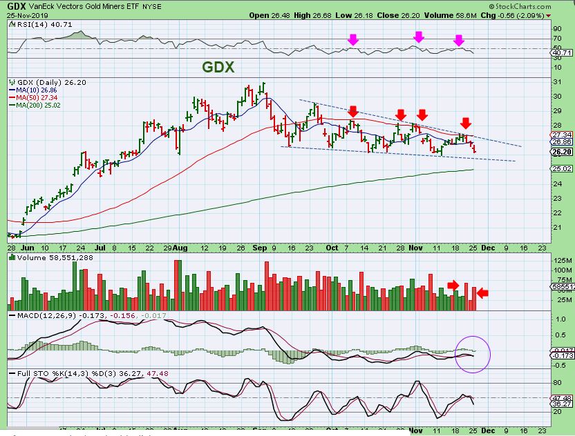 GDX – GDX dropped and is also threatening the recent lows, with an increase of selling volume. It has been very choppy, so both bulls and bears ( JDST & JNUG holders) have not been happy with the lack of progress.