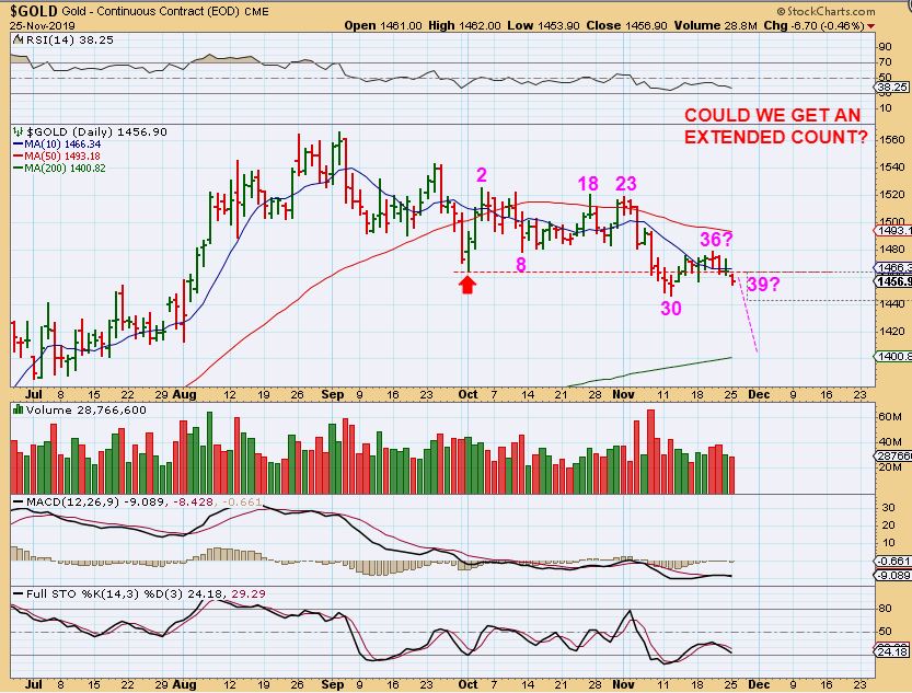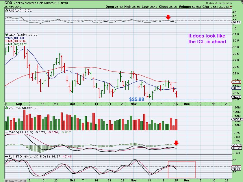The sideways chop in the precious metals sector is putting traders to sleep. We have been waiting for confirmation of an ICL with a strong rally higher, or a break down in the daily cycle that will lead to a final low and then a rally out of an ICL.  The current choppy sideways action is helpful, because sentiment was getting too Bullish with the last run higher.  Now many are losing interest in the sector as it churns sideways and sentiment drops.  We could still see a sudden burst higher and a rally could surprise everyone, but it seems more likely that we will visit the 200 sma area.  If we could see a sell off below recent lows where price drops lower, it could make for a great trade opportunity in December when we get the final lows in place.   For now, I will discuss a few trade ideas below, but remember that this weeks trading is a short week in the U.S.