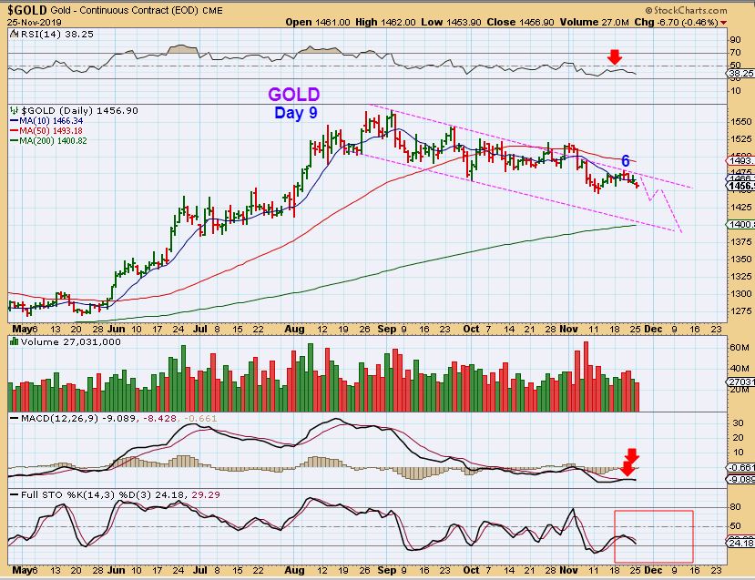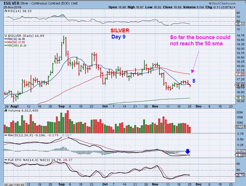 GOLD DAY 9 – Gold dropped Monday and closed below the 10sma.   It has a day 6 peak, and this would be L.T. if that peak is never taken out.  The lows need to hold or we have a failed daily cycle & Gold will then push down into the real ICL with a day 6 peak.