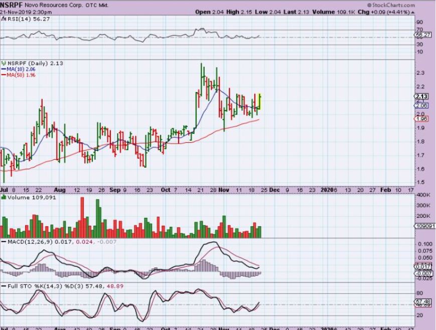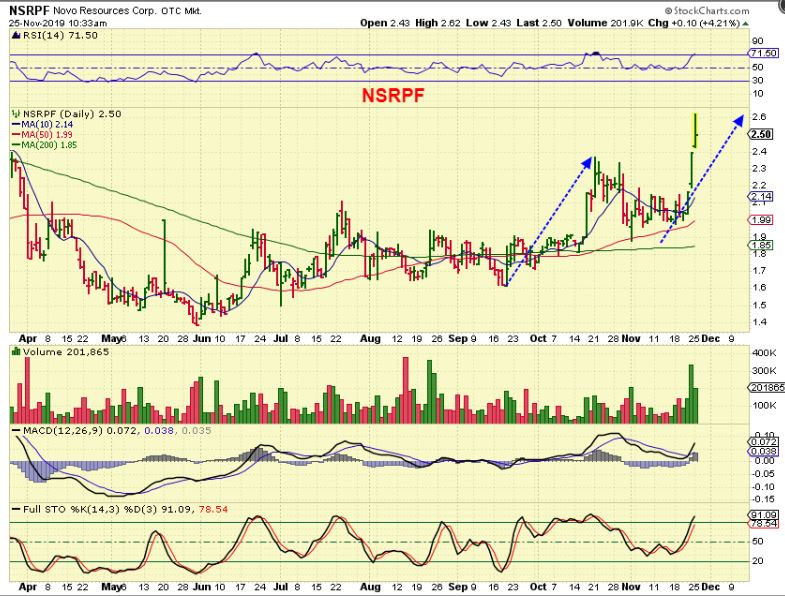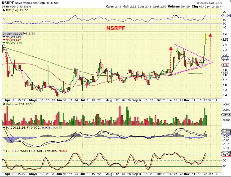 NSRPF NOV 21 –  You can see that that Bull flag  ( end of Oct) Actually broke down. I then pointed it out here as a triangle on the 200sma last week.  This was midday and I saw volume coming in & price rising WHILE GOLD WAS DOWN. I could not find any news.