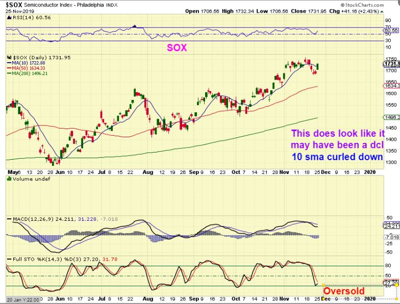 SOX  – The Semiconductors actually do resemble a dcl, as the 10 sma dipped down with price closing below that 10sma. Also the SOX became oversold while the SPX, DJIA, and NASDAQ stayed over bought. At this point the divergence seems to indicate that it will get choppy or toppy short term.