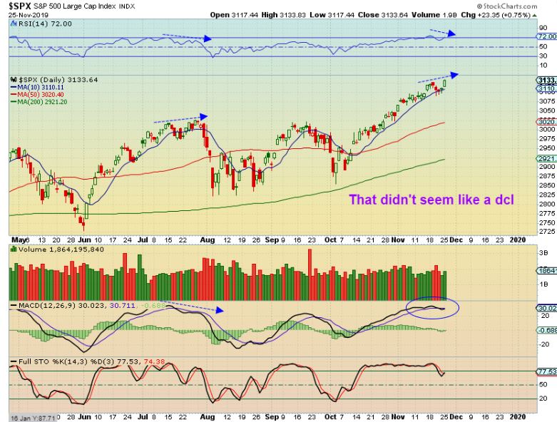 SPX – The 10 sma never dipped down, price didn’t close under the 10sma, and I see divergence on the move to highs here. For those reasons,  this doesn’t really seem like we had a mild dcl. It looks like a continuation of the same daily cycle.