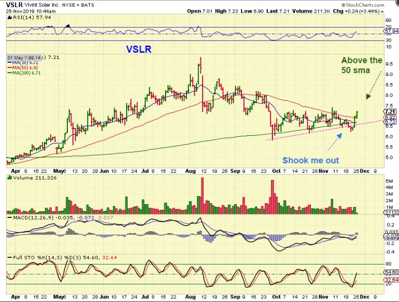 VSLR  – VSLR has also been riding along the 200sma and now pushed back above the 50 sma, so there is a chance that this will try to run back to recent highs.  It is also a low risk entry and I bought this one too.