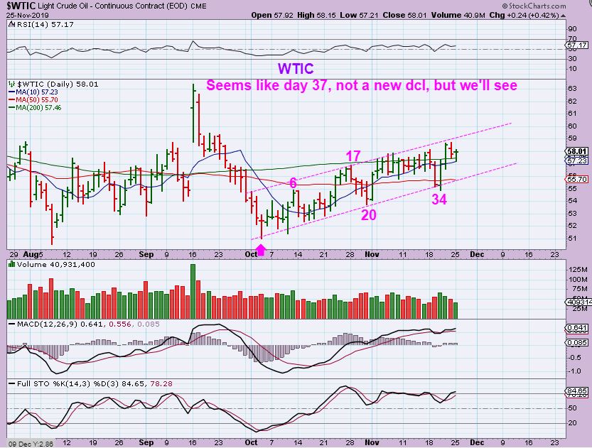 GOLD  – The 10 sma did not really turn up, so is it possible that we could get an extended Daily cycle  ( Say day 43 low) and then the ICL is in place?  I wouldn’t rule it out, simply because the consolidation has kept many Miners in a Bullish formation.  Picture an A-B-C down from day 23 to day 30, to day 36 and to the 200 sma area.