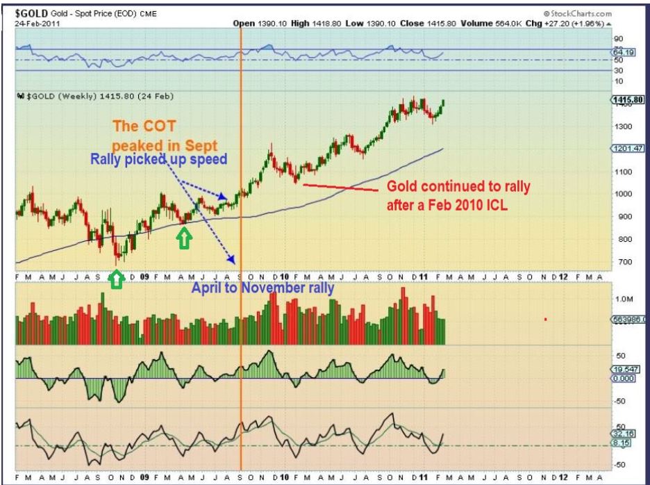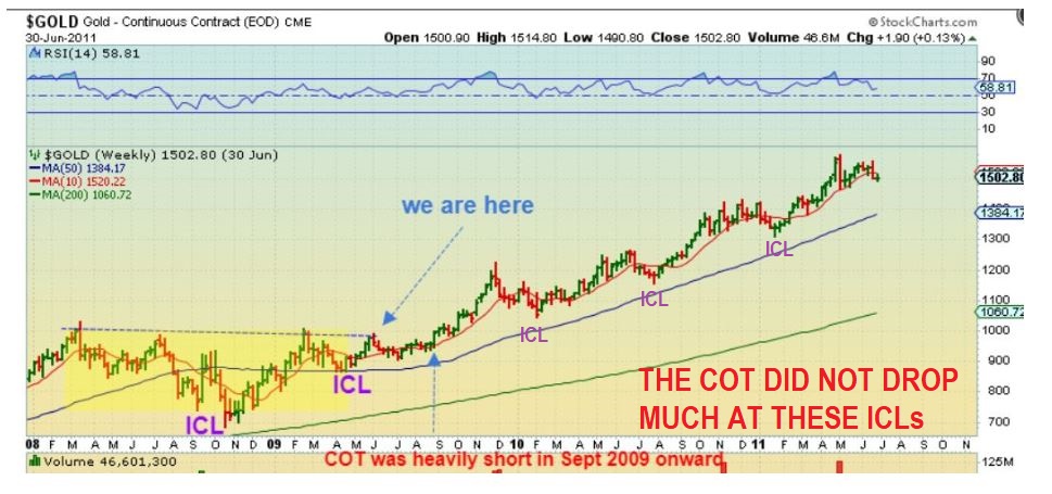 GOLD 2008 – 2011 – (Ignore the blue writing, I drew this chart up at a different time as we broke from the base). So here it is again. As the price of Gold dropped from Nov 2009 – the Feb 1 2010 ICL, the COT did not drop much at all and the rally continued that way for years with Mild dips.