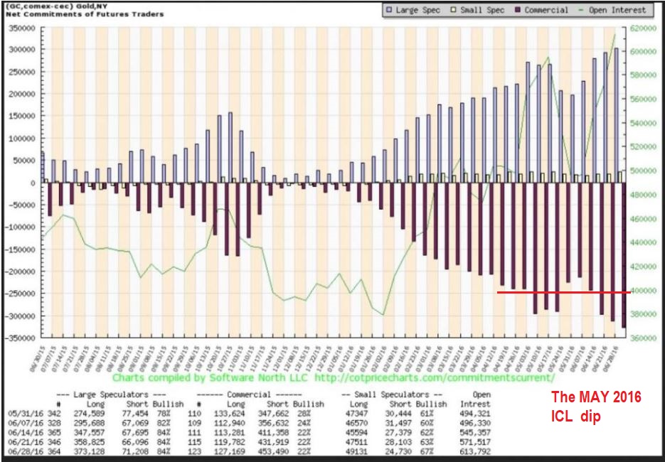 GOLD COT MAY 2016 – Here it is again, and the COT dropped quickly at the final 2 weeks of May only, and landed no where near prior ICL levels. Now let’s look at Gold 2016…