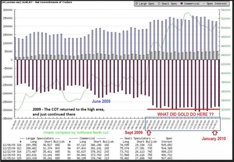 GOLD COT SEPT 2009 – Many recall that GOLD BOTTOMED IN OCTOBER 2008 after a massive sell off. Notice here that the shorts of the COT climbed all year long in 2009 & into 2010, and they did NOT drop much at the end of 2009 and into 2010. The shorts kept climbing, but The next Icl was late Jan 30 2010.