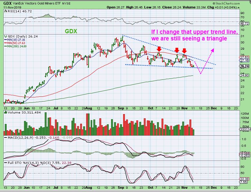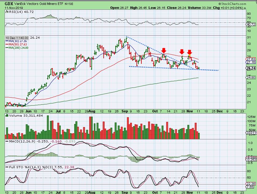GDX #1 – GDX made a new low, but the drop is pretty tame so far. I’d love a flush down just to end the selling with conviction. Notice that blue triangle that I had drawn several weeks ago, and…