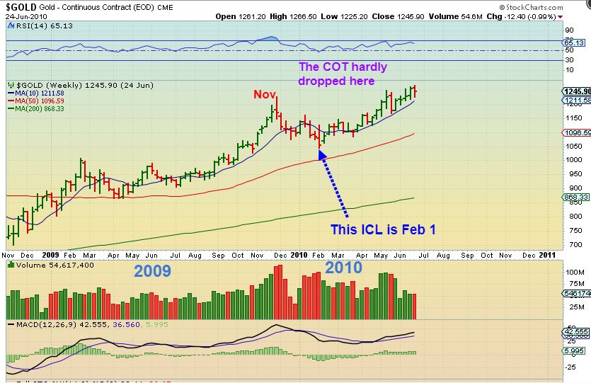 GOLD WEEKLY 2009-2010 – There was about a $200 drop in Gold in a-b-c manner to the Jan/Feb 2010 ICL, but the COT did not drop to prior ICL levels. Those commercial Shorts remained relatively high…
