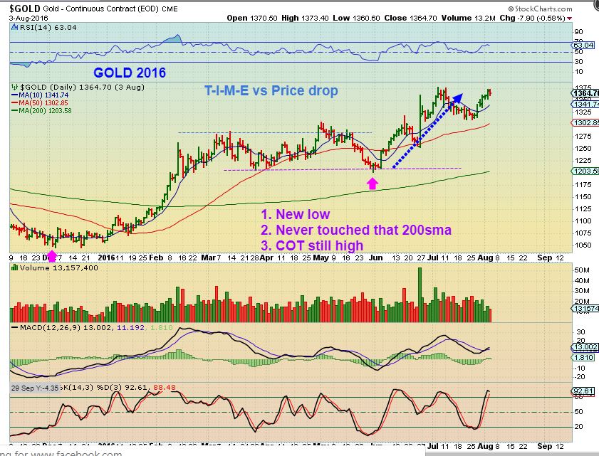 GOLD 2016 – Do you see Golds drop to new lows in May? Very Mild and it was mostly sideways, not a Deep drop like we usually see. In this case, ‘time’ became more of a factor, not a deep drop. Gold bottomed in early Dec 2015, and roughly 6 months later it bottomed in may 2016, but that was a VERY MILD dip. The lows of March were hardly broken, the 200sma was not tagged, and the COT didn’t drop a lot, but Gold did take off after making slightly new lows in May. Gold went on to make new highs into June, July, & August.