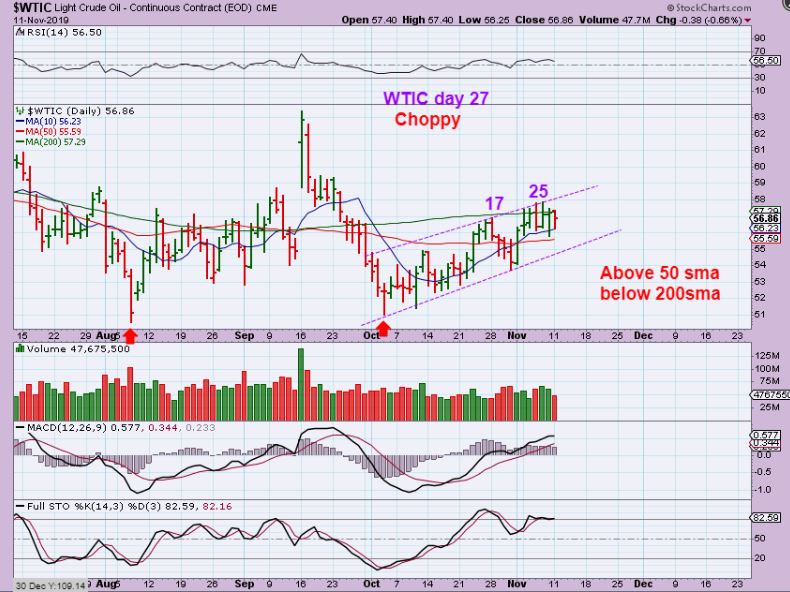 WTIC – Oil is above the 50 sma and below that 200sma, it remains choppy and is also on day 27. Oils daily cycles can run longer, so Oil may be a little more than 1/2 way through the daily cycle. It should be R.T., but it is still struggling to make upward progress.