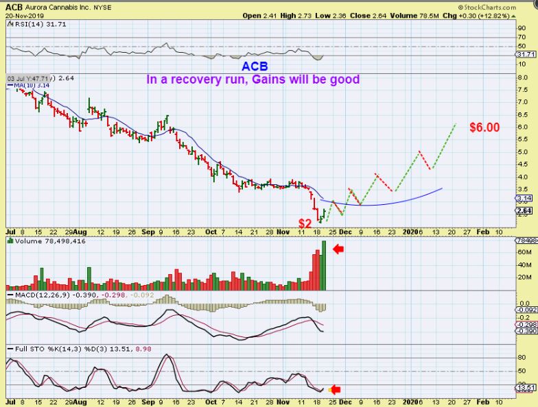 Many MJ Stocks have bounced out of their lows recently, only to roll over and make new lows again & again.  Most have not bottomed properly, but they will eventually do so and when they do, they can move Very Quickly Higher.  A step to Federally legalize Marijuana in the US was passed on Wednesday, and you’d have to expect that to have a bullish affect on the sector.   In fact, several MJ Stocks were up Thursday 15-50% in 1 day!  THAT is great, but it also makes them VERY HIGH RISK- not for conservative traders, since they could pop 30% one day, and drop 15% the next.  Take a look at 3-6 month charts of ACB, HEXO, CGC, CRON, APHA, etc and you will see what I mean.  I will monitor them as we move forward and some of the smaller stocks popped even bigger than those.