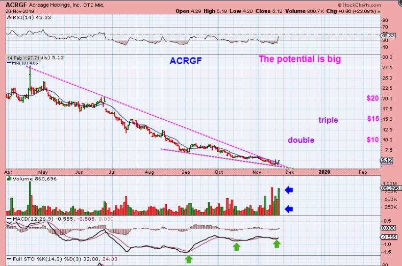 I am going to show just 1 interesting MJ stock below, because after this big of a sell off, many look to have great potential when it really gets going.  You can keep it on a watch list and wait for it to make progress. I took a small position at the $4.50 area when BIG VOLUME started pouring in as a trade for now. That stock is ACRGF.