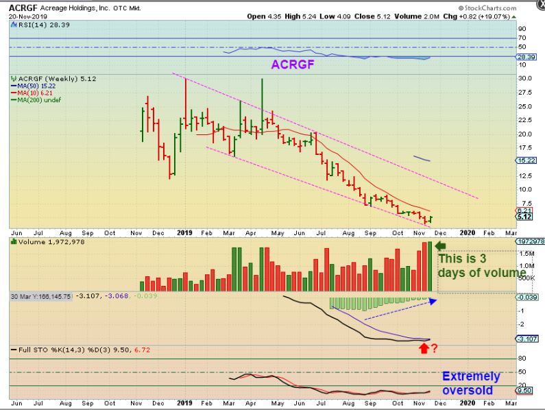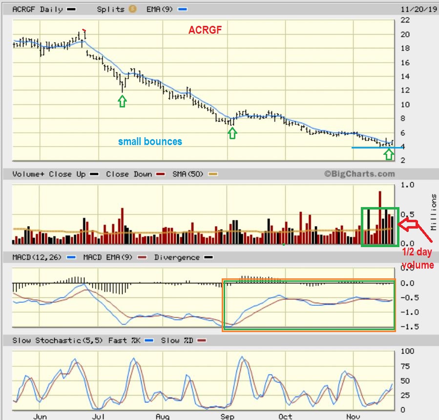 ACRGF DAILY – Here I am just showing a few ‘False Starts’ or bounces during the sell off, but this one does have pretty good volume coming in.  That can be a sign of shorts covering & Buying coming in.  Do you see the potential if this starts to turn around & move higher?  The next chart will detail that.
