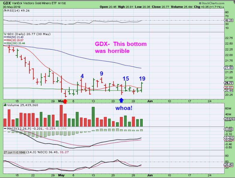 Yesterdays report showed the May ICL for GDX as a reminder of how choppy & difficult bottoms can be.  After that low was in place, I think we’d all agree that the following 3 weeks were very frustrating.   Here it is again, I find it to be a helpful reminder: