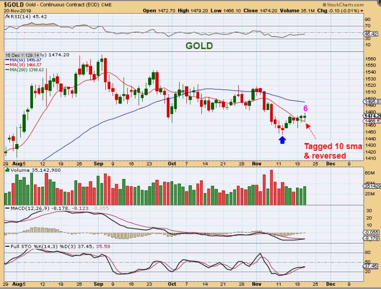 GOLD  – Gold dropped but it stayed above the 10 sma on day 6 & bounced back.  So far, we have our low in place, we are waiting for it to pick a direction to trend in.